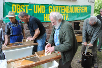 Den "5. Kappestag" feierten Heimat-verein und Obst- und Gartenbauverein Honzrath vor der Steinbrecherstube" bei der ehemaligen Grundschule. Zahlreiche interessierte Besucher nutzten bei schönstem Herbstwetter die Gelegenheit, zum Mittagessen eine kräftige Mahlzeit mit Dürrfleisch oder Kochwurst mit Püree und selbst eingemachtem Sauerkraut zu genießen. Bei Kaffee und Quetschenkuchen konnten sie miterleben, wie der "Kappes" gehobelt und sach- und fachgerecht eingemacht wurde. Viele hatten ihr eigenes "Kappesbüttchen" mitgebracht und ließen sich zu einem geringen Kostenbeitrag ihren Wintervorrat einstampfen.