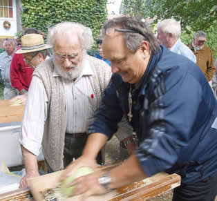Regen Interesses erfreute sich der diesjährige Kappestag, der traditionell von der Mundartgruppe des Heimatvereins gemeinsam mit dem Obst- und Gartenbauverein vor die Steinbrecherstube der ehemaligen Grundschule stattfindet. Das Mittagessen mit Seitenfleisch und Mettwurst mit Sauerkraut und Püree war begehrt und schnell ausverkauft. Aber es gab ja noch Kaffee und Kuchen. Vorrangig ging es jedoch um die Herstellung von Sauerkraut. Insgesamt 120 Kilo Weißkraut wurden auf zwei Kappesmessern mit beweglichem Schlitten und scharfen Messern mit flinken, kräftigen Händen zu dünnen Streifen gehobelt und in untergestellten Bütten gesammelt. Dann wurde das Kraut gesalzen, mit Wacholderbeeren angereichert und in die vielen mitgebrachten Steingutgefäße unterschiedlicher Größen gefüllt, gestampft und dann luftdicht verschlossen. Sie wurden mit nachhause genommen und werden nun in den Keller gestellt, wo das Kraut bei einer Temperatur von acht bis zwölf Grad etwa fünf Wochen, je nach gewünschtem Säuerungsgrad gären wird, ehe es wohlschmeckend zu bestimmten Speisen auf den Mittagstisch kommt. Werner Reinert als Vorsitzender des Heimatvereins, Herbert Engstler als Vorsitzender Mundartgruppe und OGV-Vorsitzender Helmut Barthen waren mit der Resonanz der Veranstaltung sehr zufrieden.