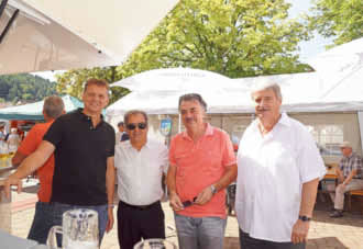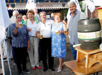 | Ein Prosit nach dem offiziellen Fassanschlag durch Ortsvorsteher Joachim Gratz mit der Vorsitzenden des Dorffeschd-Organisationskomitees, Karin Schönberger, der stellvertretenden Partnerschaftsvereinsvorsitzenden Annerose Jakobs sowie den französischen Gästen Francis und Maria Correa. |