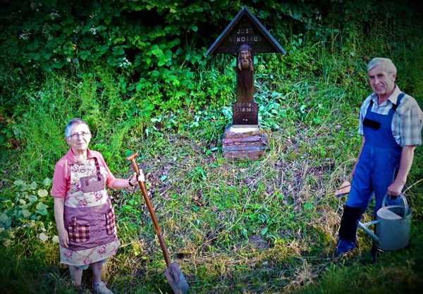 | Die Honzrather Heimatvereinsmitglieder Hilmar und Marga Grün haben das Kreuz mit der Inschrift des hier 1846 erschossenen Feldhüters Nikolaus Jost wieder erneuert. Foto: Norbert Becker |