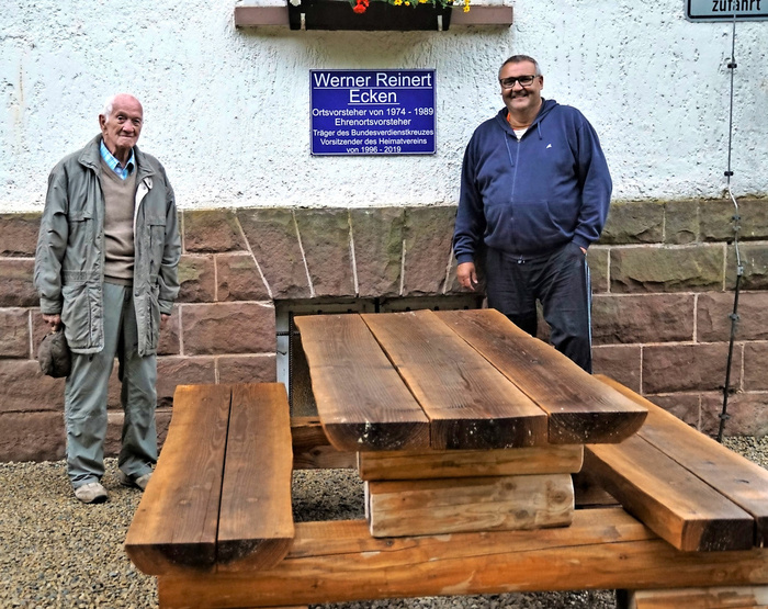 Der neugestaltete Platz, der im Rahmen der Vorstandssitzung begutachtet und für gelungen befunden wurde, ist mit Zustimmung des Ortsrates dem Gründer des Heimatvereins Werner Reinert, der kürzlich das 84. Lebensjahr vollendete, als Dank und Würdigung seiner langjährigen Arbeit gewidmet. Eine angebrachte Tafel trägt die Beschriftung „Werner-Reinert-Ecken“ mit den den Zusätzen „Ortsvorsteher von 1974 bis 1989“, „Ehrenortsvorsteher“, „Träger des Bundesverdienstkreuzes“ und „Vorsitzender des Heimatvereins von 1996 bis 2019“. Reinert bedankte sich für die ihm zuteil gewordene Ehre und will noch weiter aktiv im Heimatverein mitwirken, solange es geht.